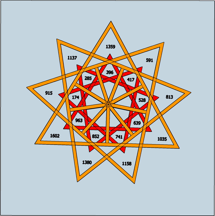Here is the Solfeggio standard picture with more interesting conclusion. When you subtract numbers between the triangles as example 417-396=21: 528-417=111 and so on, you can see the beauty beneath.
